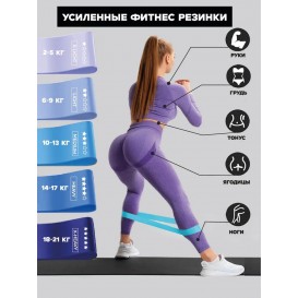 В набор входит 5 фитнес лент с различной степенью нагрузки. Каждая спортивная резинка имеет индивидуальную упаковку и маркировку жесткости. Также резинки для фитнеса можно использовать при реабилитации после травм, создавая нужную нагрузку, при этом не применяя тяжелые веса. Резинки для фитнеса можно использовать на работе, во время тренировок в зале, на природе или дома. Они изготовлены из натурального силикона, благодаря чему они прочные и хорошо тянутся.