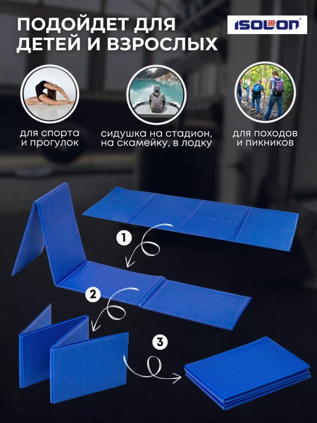 Универсальный складной коврик для занятий фитнесом, который обеспечит комфорт и защиту во время растяжек и тренировок, будет полезен на пляже, подойдет для легких однодневных походов, для разминок и йоги на природе или послужит в качестве подкладки для хозяйственных работ.
