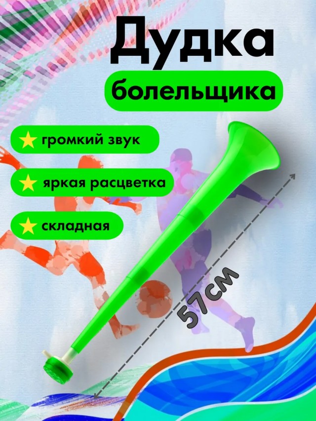 Дудка болельщика складная. Гудок длина в развернутом виде: 57см.Длина в сложенном виде: 25 см. Изготовлено из полимерных материалов, пластика. Для детей от 3-х лет. Спортивная атрибутика