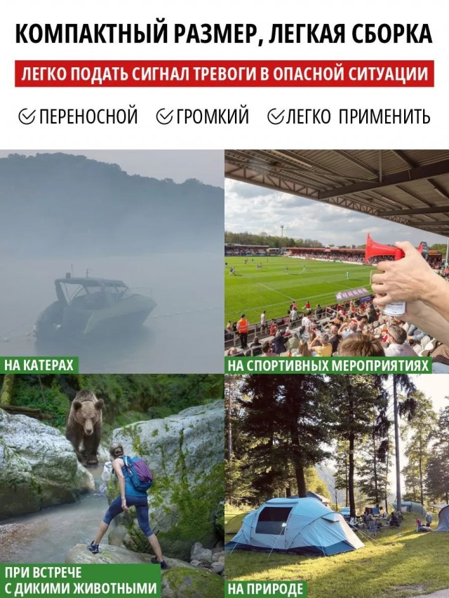 Super Сигнал - это звуковое сигнальное устройство, состоящее из аэрозольного баллона объемом 210мл и специальной насадки. Оно предназначено для подачи резких (сильных) звуковых сигналов в случае опасности или бедствия, в походах, на спортивных мероприятиях, для отпугивания диких животных, при эксплуатации маломерных судов в условиях плохой видимости и в тумане. Инструкция по применению: Держите баллон в правой руке в вертикальном положении, направив в сторону от себя, подальше от лица. Возьмите левой рукой горн насадку красного цвета и вставьте на баллон, так, чтобы насадка горна попала в паз насадки на баллоне. При этом черная задняя сторона горна должна быть направлена в вашу сторону, а широкая часть горна в противоположную. Большим пальцем левой руки резко нажмите на красную кнопку насадки в верхней части горна до упора, так чтобы появился сигнал. Сигнал будет сильным! Не направляйте горн в сторону человека! Применять устройство строго по его назначению. Нельзя встряхивать или наклонять баллончик перед или во время использования.