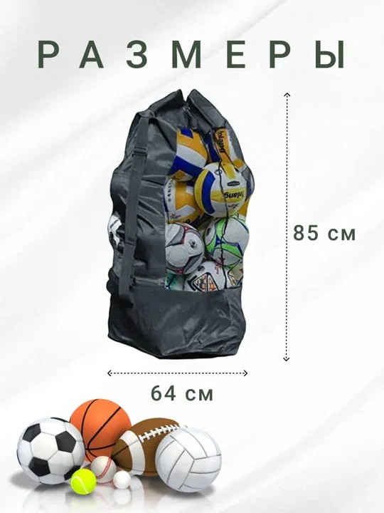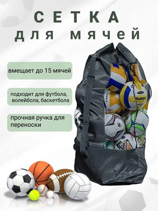 Большая сетка для переноски и хранения мячей, позволяет хранить и переносить до 15 мячей. Основное назначение инвентаря — удобная транспортировка большого количества футбольных, волейбольных, баскетбольных, гандбольных или других мячей. Её удобно использовать в учебных заведениях, в спортивных клубах, например, когда учащиеся или спортсмены выходят из зала тренироваться на открытую площадку. Сетка баул идеально подходит для хранения мячей таких видов спорта как футбол, волейбол, баскетбол, мини-футбол, регби, пляжный волейбол, теннис и др. Сетка для мячей вмещает до 15 футбольных мячей. Сумка выполнена из прочных материалов. Для переноски используется лямка на плечо, которая регулируется до нужной длины. По бокам у сумки есть сетчатые вставки, для проветривания. Сверху рюкзак для мячей закрывается на крепкую стяжку. Сетку также можно использовать для переноски и хранения спортивного инвентаря (манишек, фишек, конусов, лесенок). Баул спортивный является удобным аксессуаром для любого тренера. Также сумку можно использовать для хранения мячей дома, в школе, детском саду или спортивной секции.