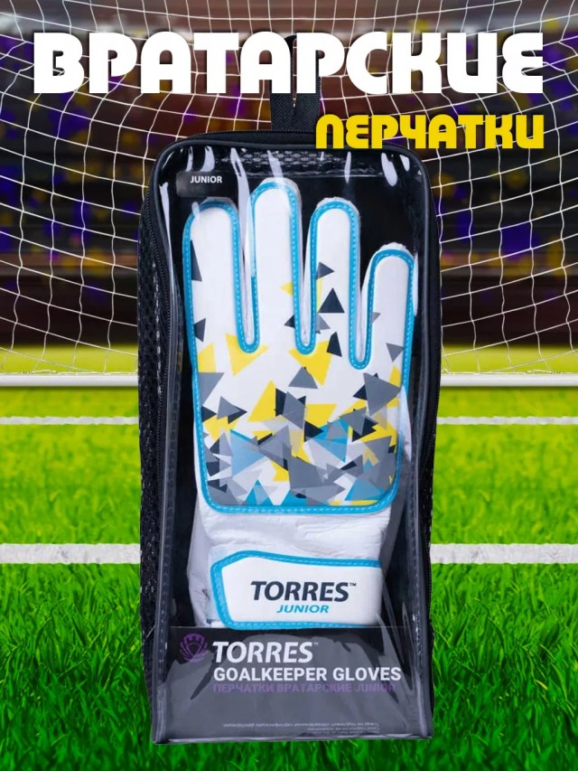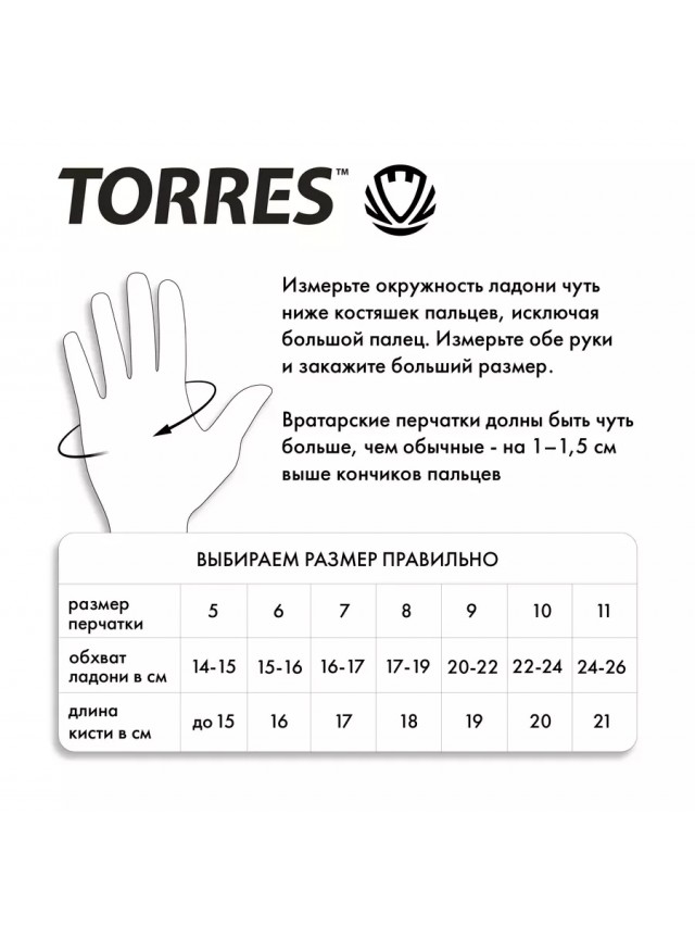 Тренировочные вратарские перчатки TORRES Junior. Ладонь из мягкого латекса толщиной 2 мм, тыльная сторона из синтетической кожи ПВХ (поливинилхлорид) толщиной 1 мм. Внутренняя подкладка из мягкой ткани для комфортного использования. Боковые вставки в пальцах из мягкой дышащей ткани, манжеты изготовлены из синтетической кожи (ПУ). Манжеты на удлиненной застежке шириной 5 см, которая полностью обхватывает запястье, обеспечивая удобную посадку, поддержку кисти и надежную фиксацию, на липучке. Упакованы в фирменную сумку для переноски и хранения