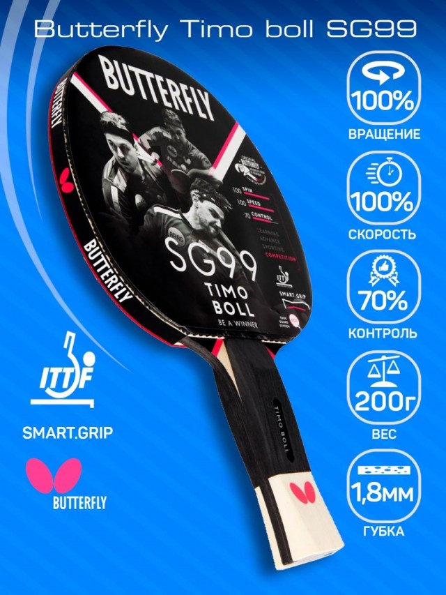Ракетка для настольного тенниса Timo Boll SG99 от культового производителя профессионального инвентаря BUTTERLY. Использована накладка Wakaba ITTF с губкой 1,8 мм. Теннисная ракетка Butterfly Timo Boll SG99 предназначена для опытных игроков обладающих хорошей техникой, предпочитающих мощную атакующую игру. Инновационная технология ручки smart_grip для комфортного хвата и улучшения контакта с ладонью. Вращение: 100%. Скорость: 100%. Контроль: 70%. Вес 170 гр.*итоговый вес может отличаться +/- 10 гр.