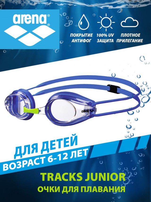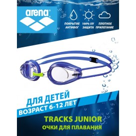 Стартовые плавательные очки для детей Tracks Junior от итальянского бренда Arena- идеальный выбор для юных спортсменов. Детские очки для плавания разработаны для использования на соревнованиях и активной подготовке к ним. Аксессуар для купания подойдет для мальчиков и девочек, т.к. отличается стильным видом и гидродинамическим дизайном. Жесткие ударопрочные линзы из поликарбоната обработаны антифог, что обеспечивает четкий, неискаженный и незатуманенный вид под водой. Для идеальной посадки в комплекте идут сменные носовые дужки. Подойдут для бассейна, моря и длительных тренировок в целом, так как состоят из мягкого уплотнителя, который выполнен из гипоаллергенного силикона, который гарантирует плотное прилегание и герметичность. Очки для детей и подростков арена имеют двойной силиконовый ремешок с затылочной клипсой, что упрощает процесс регулировки и лучше фиксирует аксессуар на голове. Если Вы ищите очки для соревнований и активной подготовки к ним, то это отличный вариант для пловцов от 6 до 12 лет.