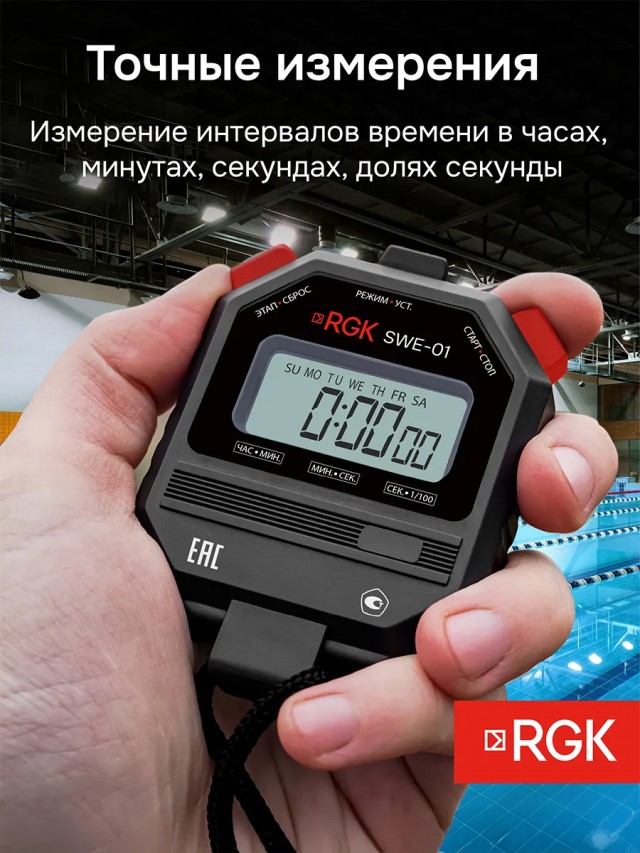 Секундомер электронный RGK SWE-01 с поверкой представляет собой портативное устройство с цифровой индикацией, предназначенное для оперативного определения длительности временных промежутков между событиями, регистрации продолжительности процессов и т.п., с разрешением до сотых долей секунды. Наличие функции повторного запуска, с многократным стартом без обнуления, дает возможность контролировать интервальные события. Модель внесена в Госреестр СИ и может применяться в ходе спортивных соревнований для фиксации показаний, а также для регистрации тайминга при решении инженерных, исследовательских и других задач.
