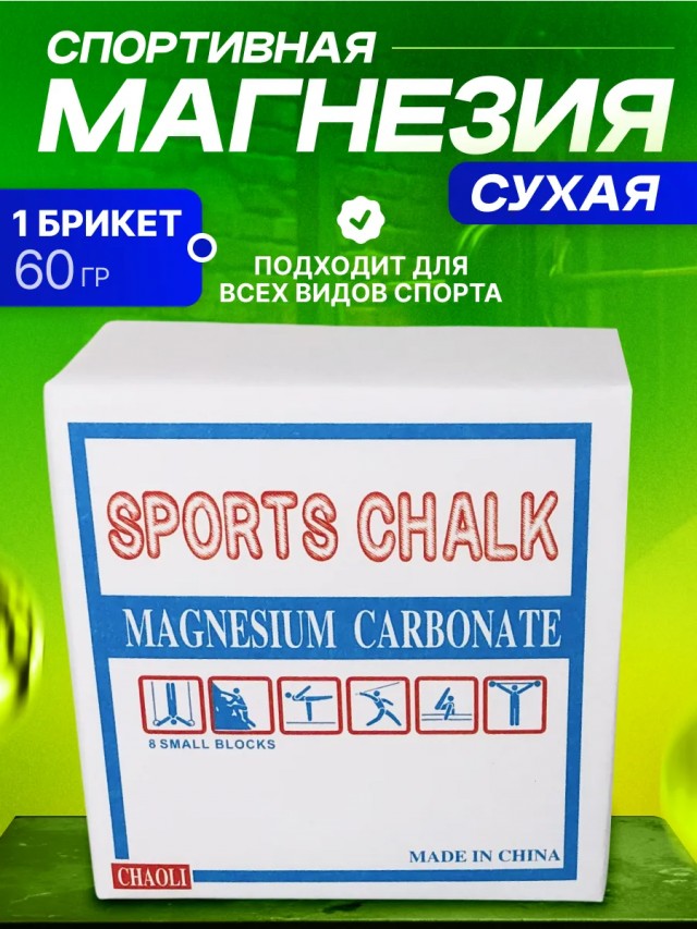 Спортивная магнезия сухая в брикете (кусок, штука, кубик) представляет собой спрессованный порошок карбоната магния. Магнезия предотвращает скольжение рук на снаряде, снижает потоотделение ладоней и повышает сцепление со снарядом, защищая от травм и кровавых мозолей. Удобная форма в брикете облегчает нанесение и экономит время и средства, предотвращая ненужные распыление и рассыпание, сокращая ненужный перерасход магнезии.