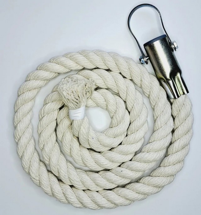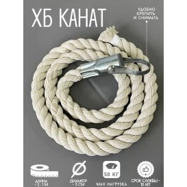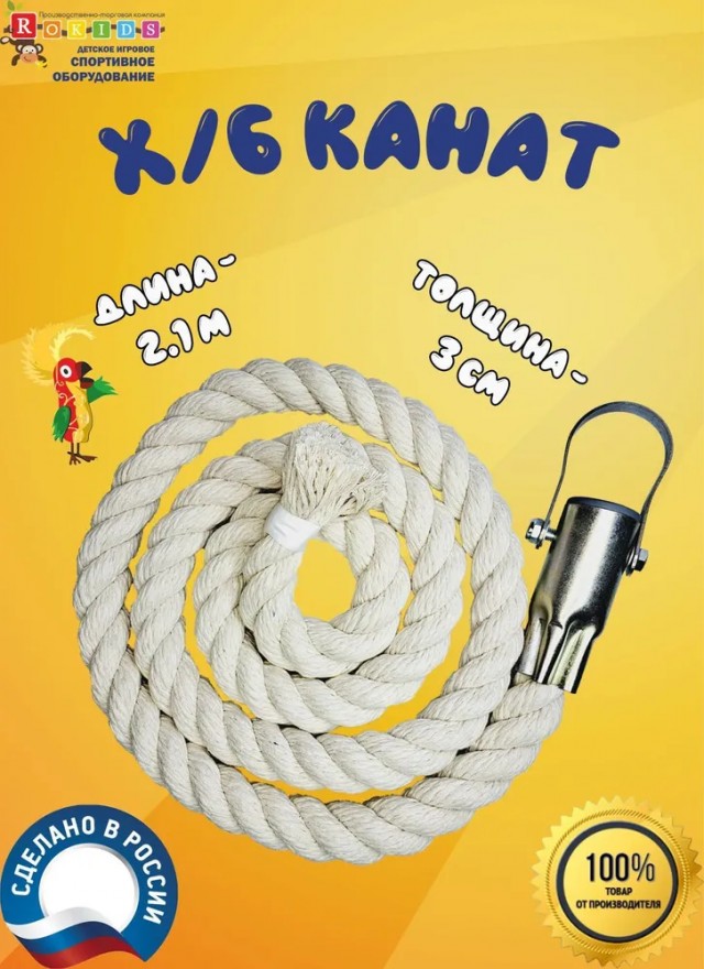 Канат изготавливается из хлопчатобумажной пряжи для шведской стенки, турника и любого места, за которое его можно подвесить. Канат диметром 30 мм. Длина: 2.1 м. Для надежного крепления канат впрессован в металлическую гильзу с кольцом