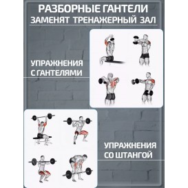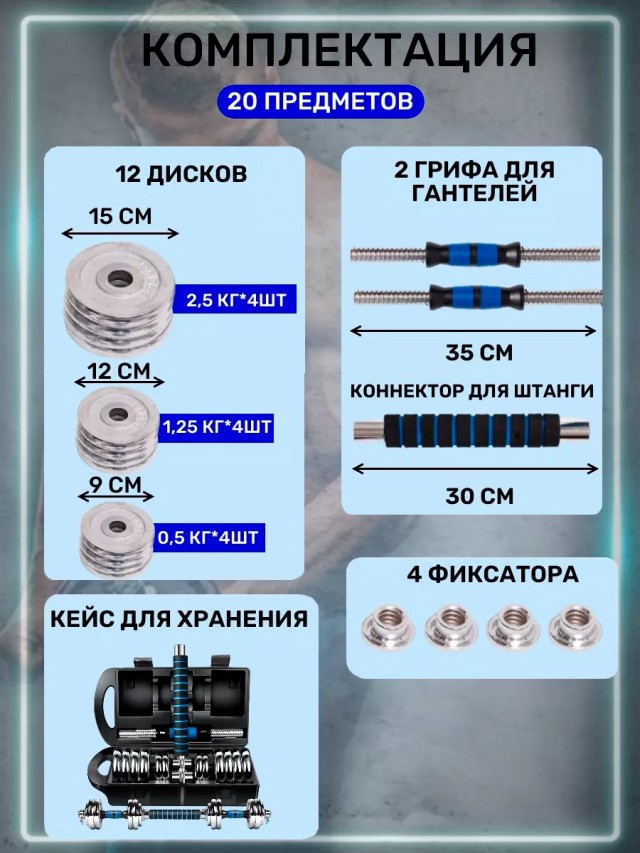 Набор стальных разборных гантелей 20 кг 2 шт. по 10 кг снаряд, который используется для силовых упражнений с отягощениями на все группы мышц в тяжелой атлетике, фитнесе, бодибилдинге, функциональном тренинге (в том числе CrossFit), силовой тренировке. Пару гантелей также можно использовать и для мужского и женского фитнеса, для начинающих и опытных атлетов. Отличное решение если нет времени ходить в спортзал, ваш домашний тренажер и фитнес всегда под рукой. С регулируемым весом, выбирайте вес, который вам под силу. Для закрепления блинов замки для гантелей в комплекте, что обеспечивает безопасность во время тренировки. С коннектором для штанги. Обратите внимание на комплектацию и общий вес. Гантель из ударопрочного материала сталь, наиболее популярны для домашних тренировок и зала. Блины изготовлены из хромированной стали, что позволяет защитить покрытие от коррозии и ржавчины. Удобная рукоятка грифа не позволит ладоням скользить за счет прорезиненной ручки. Стальные наборы в пластиковом кейсе для хранения и транспортировок-хороший подарок на праздник или по особому случаю! Набор снарядов металлических разборных с грифом - это идеальный выбор для тех, кто хочет заниматься фитнесом в домашних условиях или в спортивном зале. Включает в себя диски различного веса, что позволяет вам выбрать оптимальный вес для ваших тренировок. Каждый блин отливаается вручную. Вы сможете быстро и легко изменять вес и настройки тренировки на свое усмотрение, благодаря разборной конструкции аксессуаров.