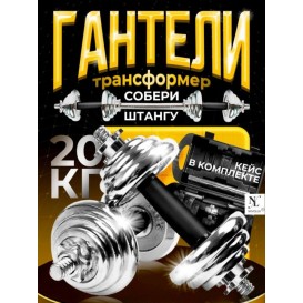 Штанга разборная на 2 гантели весом 20 кг – качественный и долговечный инвентарь для личного использования, а также для фитнес-центров, спортзалов и других спортивных организаций. Хромированное покрытие надежно защищает металл от коррозии и других повреждений. Благодаря специальному переходнику – грифу, гантели собираются в полноценную штангу. Кейс, в который складываются блины и аксессуары, удобен для переноски, а также для подарка спортсмену.