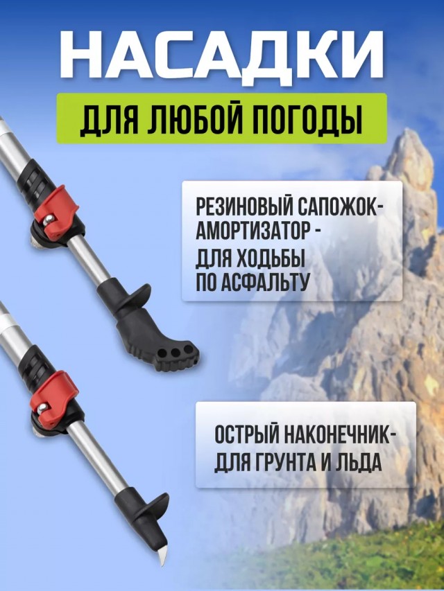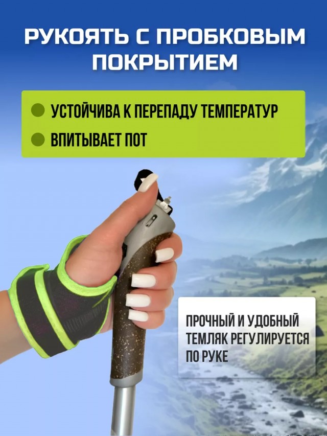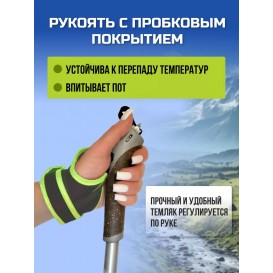 Регулируемые палки для скандинавской ходьбы, складные, c пробковой ручкой и темляком. Размеры регулировки от 82 до 135 см. Длина легко меняется с помощью фиксаторов. На стержне имеются отметки выбора длины с шагом в 1 см. Треккинговые палки для туризма сделаны из облегченного алюминия, что делает их практически невесомыми. Наконечник изготовлен из износостойкой стали, для использования на землистой местности. Насадки "сапожок", входящие в комплект, подходят для ходьбы по асфальту, для предотвращения цокания. Одним из преимуществ данного вида снаряжения - раздвижная сборно-разборная конструкция. Благодаря данной регулируемой технологии легко транспортировать походный инвентарь, взяв его в поездку или в путешествие и даже в горы и горные походы. Размер можно варьировать под любого члена семьи, позволяя сэкономить на покупке нескольких туристических аксессуаров. Удобные ручки из натуральной пробки пропитанной полиуретаном, а темляки-полуперчатки комфортно фиксируют руки. Быстро регулируются под рост человека от 130 до 190 см, с помощью шкалы, нанесенной на стержень – это спорт товары для мужчин и женщин. В сложенном состоянии длина составляет всего 82 см, набор для похода можно перевозить в спортивной сумке, а максимальная - 135