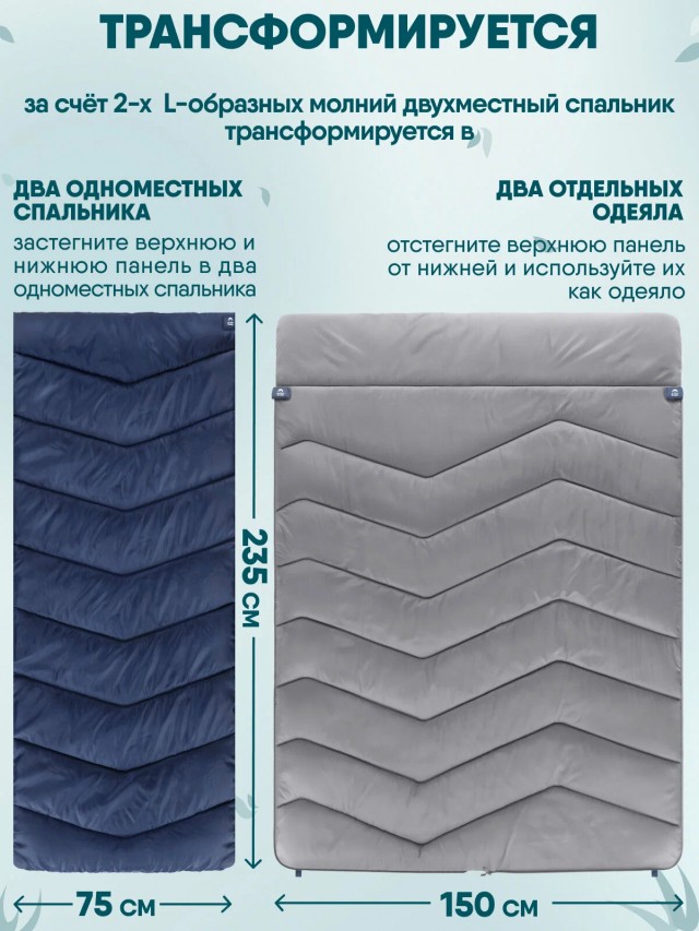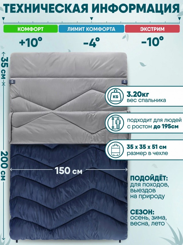 Просторный и теплый двойной спальник Jungle Camp Trento Double идеально подойдет для путешествующих парой. Предназначен для походов и кемпинга на природе летом и в весенне-осенний период, когда возможны прохладные ночи. Главными преимуществами спальника являются большой размер и наличие комфортного подголовника. Для удобного использования у спальника сделаны две молнии по сторонам. Вдоль каждой молнии для увеличения теплоизоляции расположен термоклапан, защищающий от проникновения холодного воздуха. Приятный внутренний материал Pongee позволят почувствовать себя как в домашней постели.
